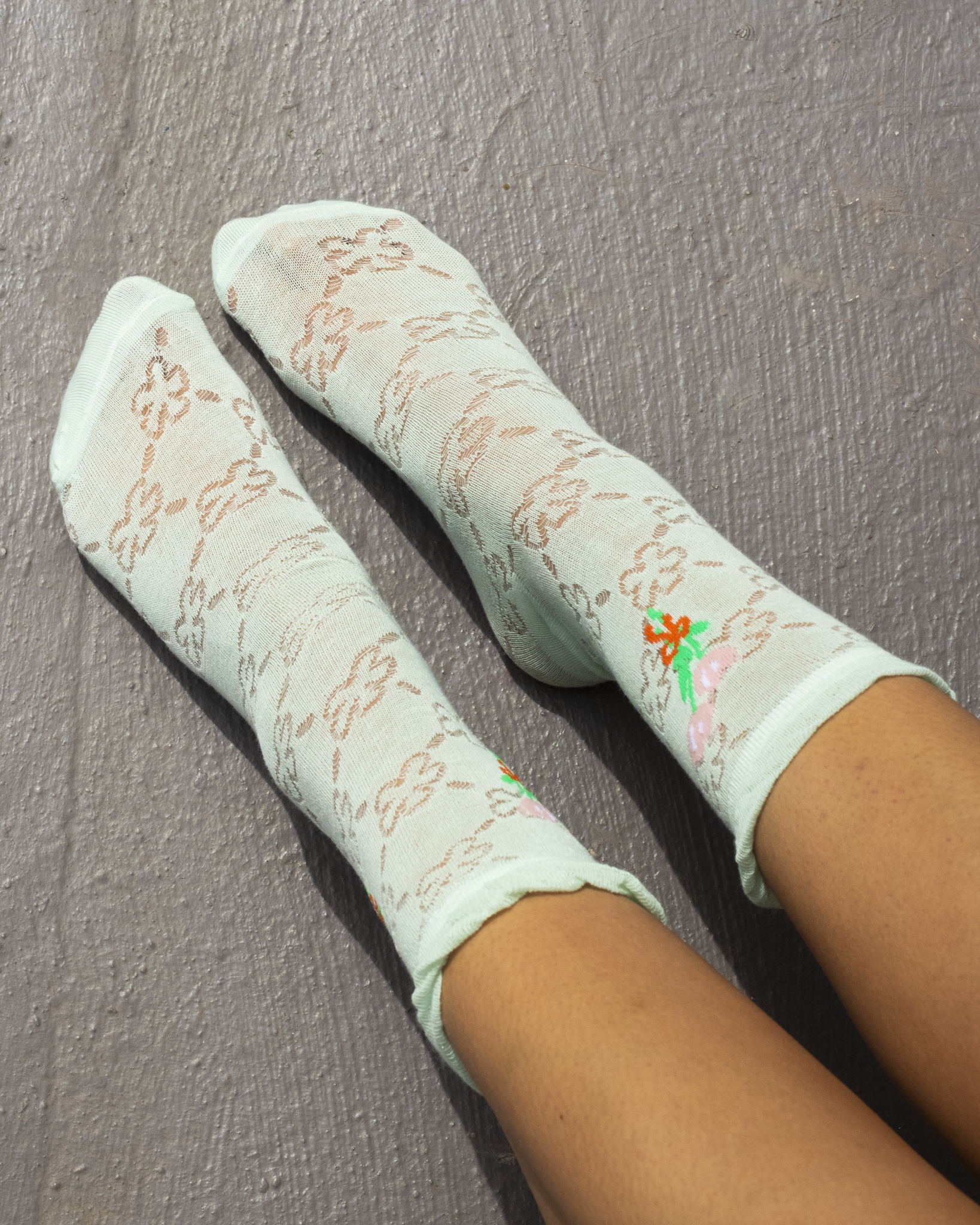 A semi-sheer sock in teal featuring a pretty floral bouquet.