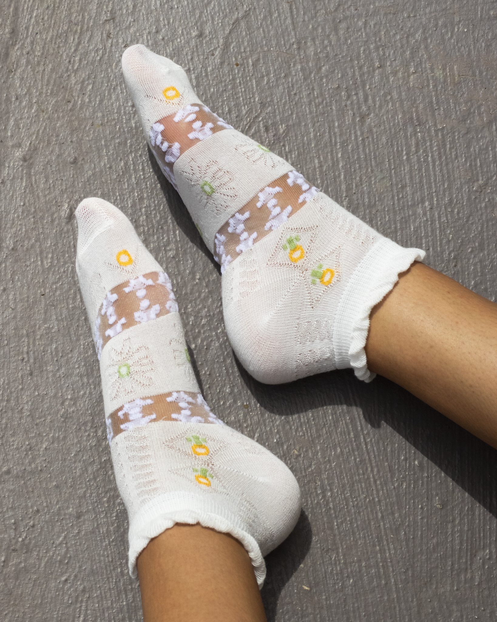SHEER ANKLE LACE DOTS YELLOW FLOWERS WHITE