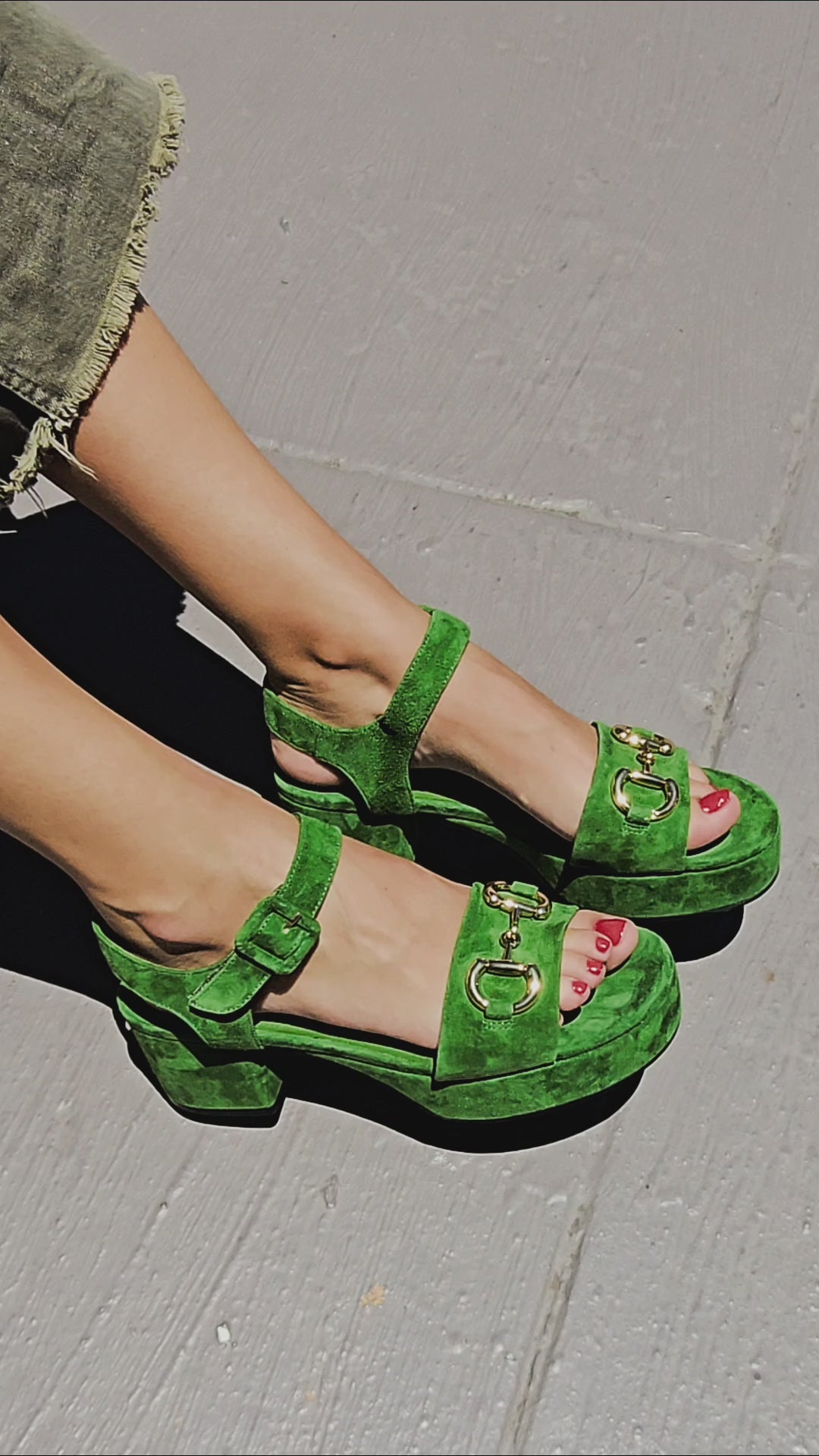 TIMELESS by Jeffrey Campbell is a flatform sandal featuring a subtle gold embellishment on the green suede upper.