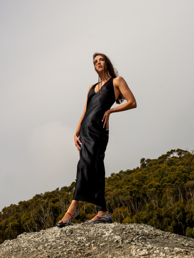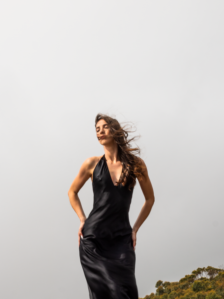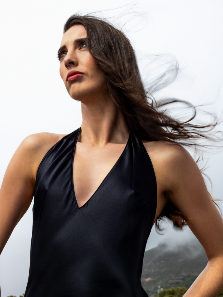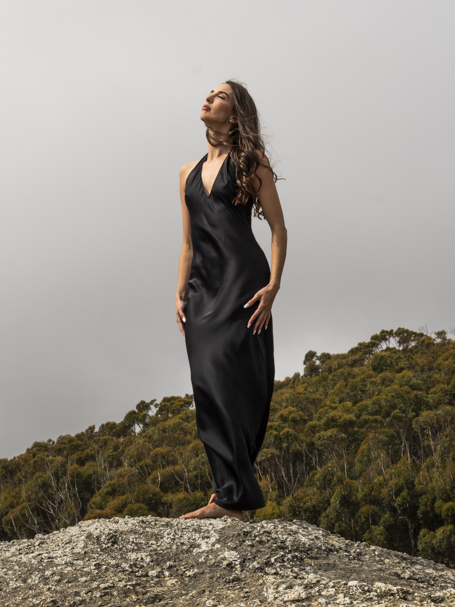 An elegant halter neck dress made from luxurious satin by New York designer, Amanda Uprichard.