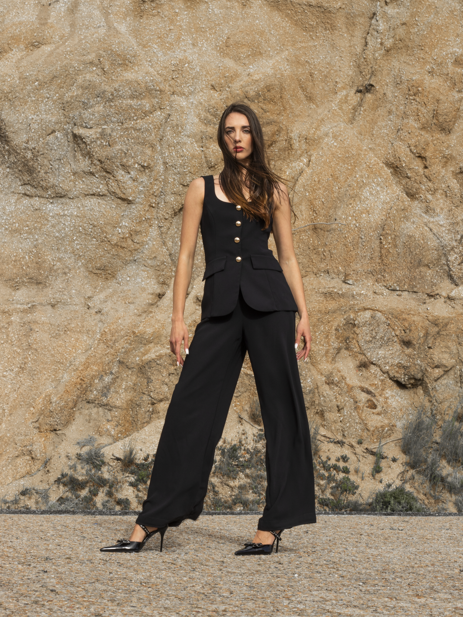 Go bold in the Kya Jumpsuit, a striking piece that blends modern style with timeless elegance. Featuring a tailored top with a flattering scoop neck and accent buttons, this jumpsuit makes a statement with its wide-leg pants that add flow and confidence to your look. The perfect mix of bold and refined, this jumpsuit will take you from day to night in style.