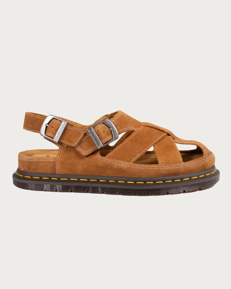 A soft and strong summer. The new Archive Fisherman sandal. Built from Plush Suede Reverse, a soft and durable leather with a textured finish. Featuring a comfortable suede footbed. Set on the revived low-profile San outsole with a yellow welt stitch. Finished with twin adjustable buckles in brushed silver.