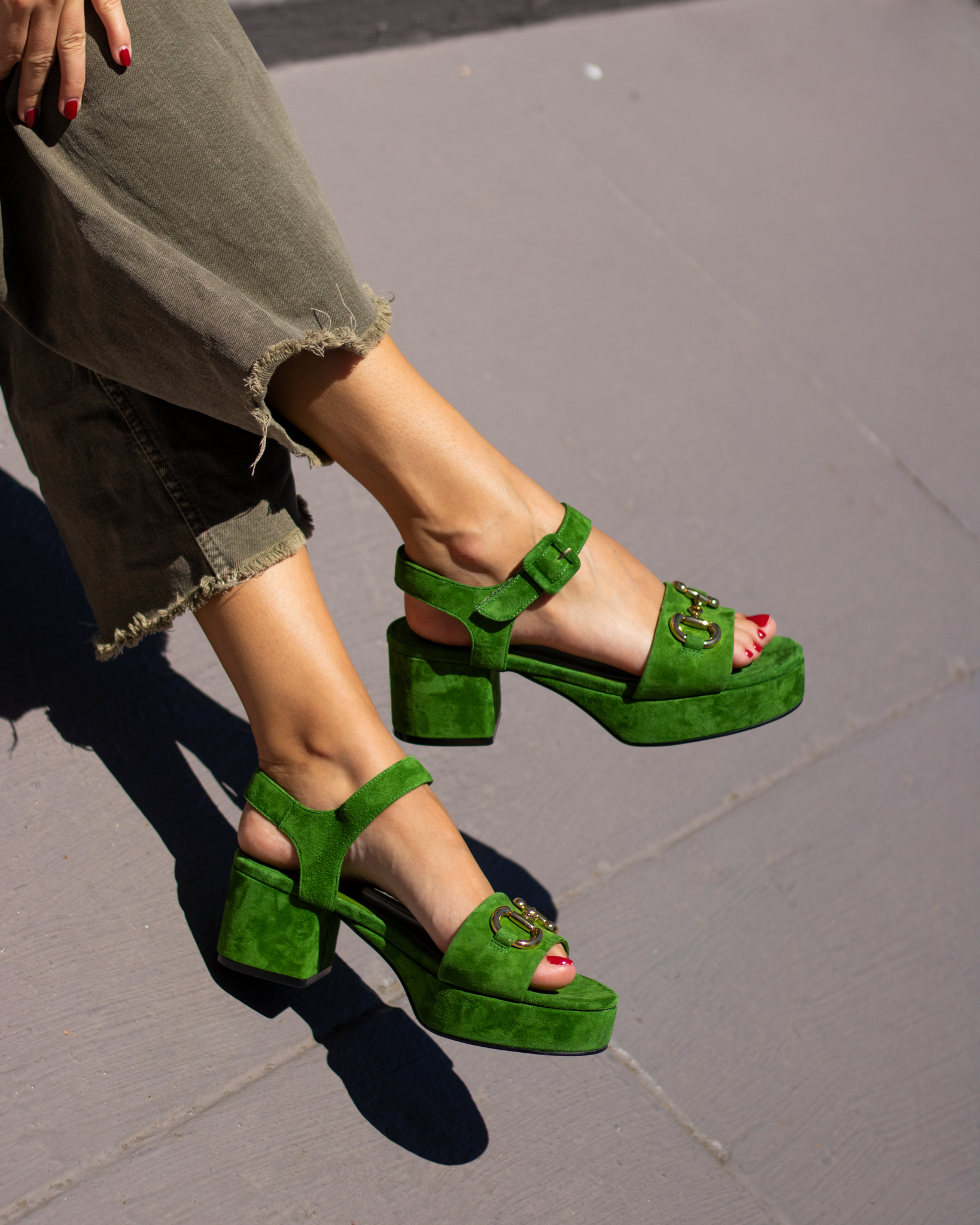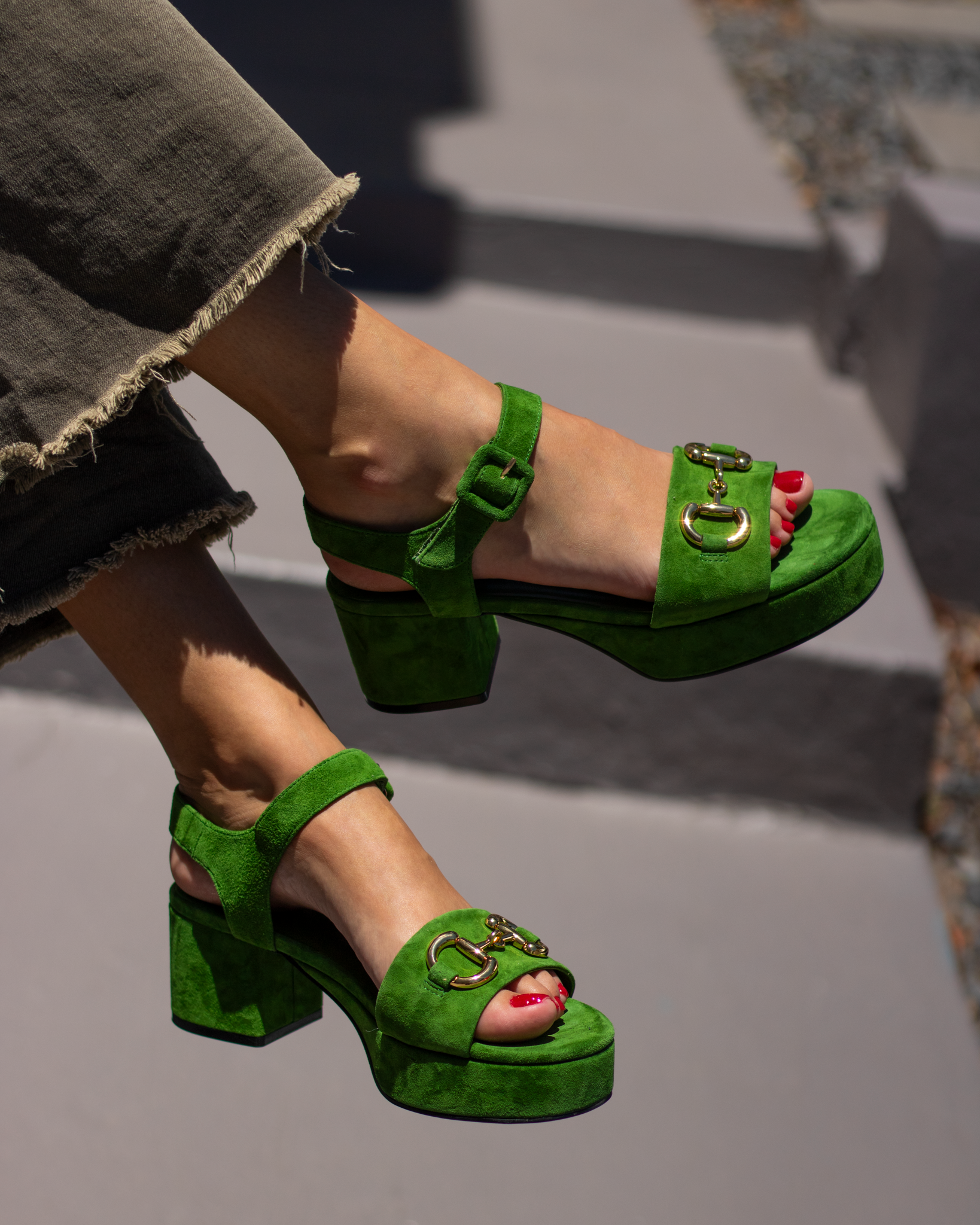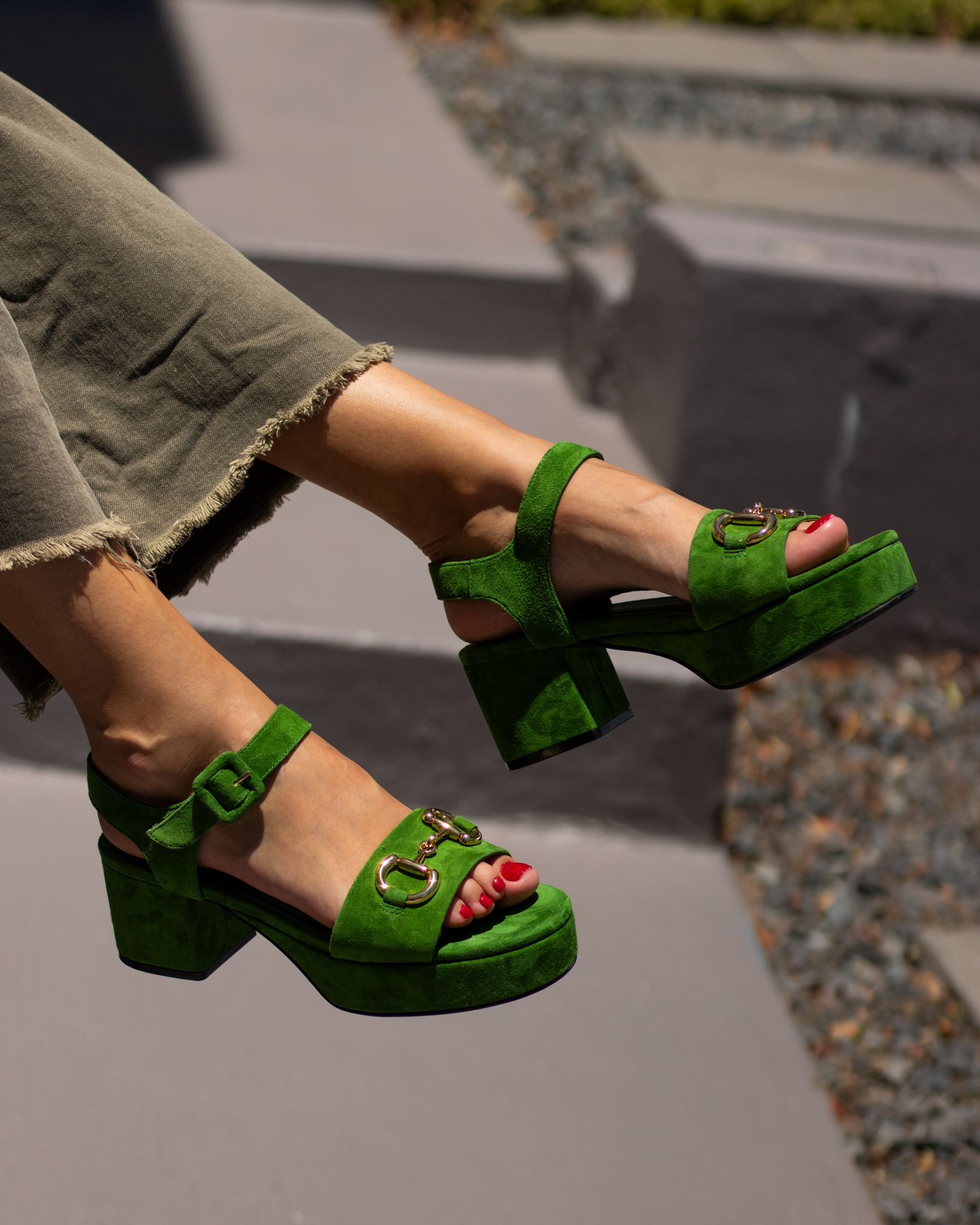 TIMELESS by Jeffrey Campbell is a flatform sandal featuring a subtle gold embellishment on the green suede upper.