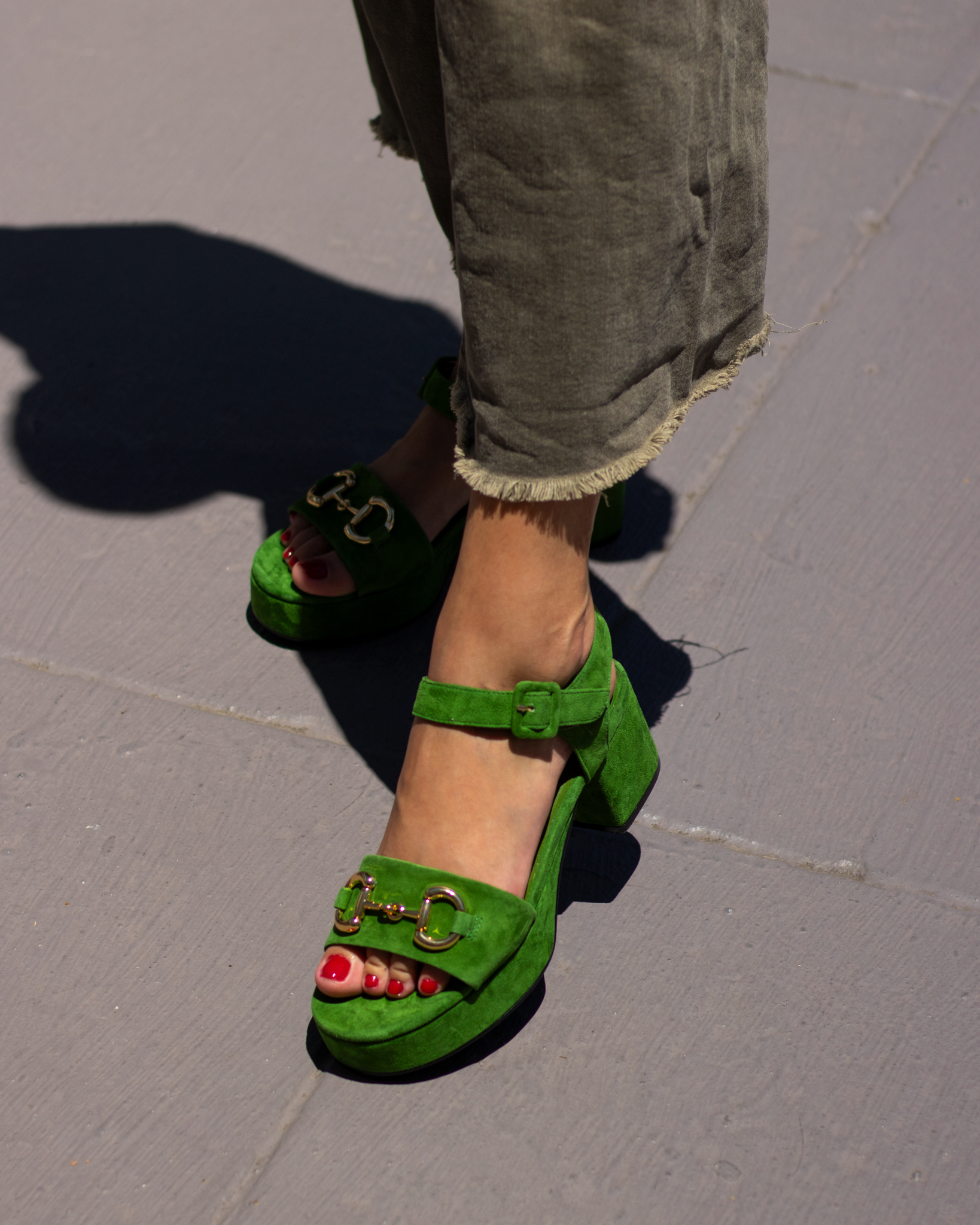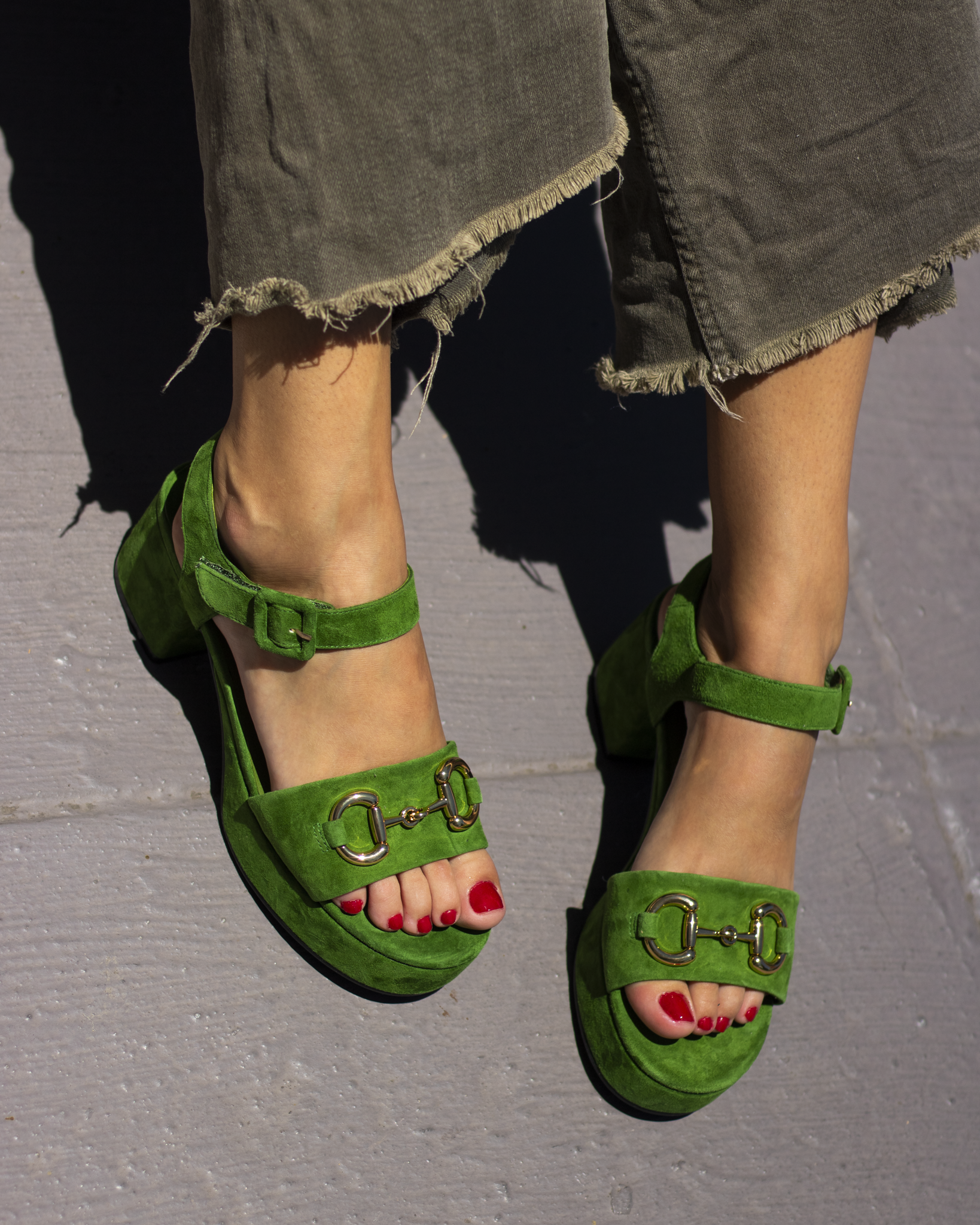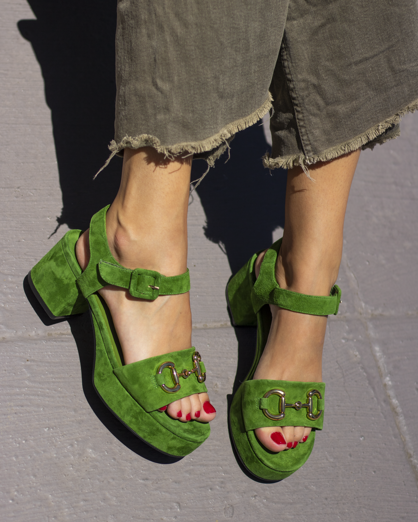 TIMELESS by Jeffrey Campbell is a flatform sandal featuring a subtle gold embellishment on the green suede upper.