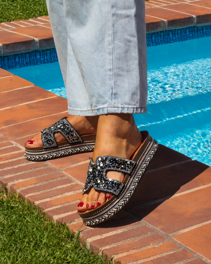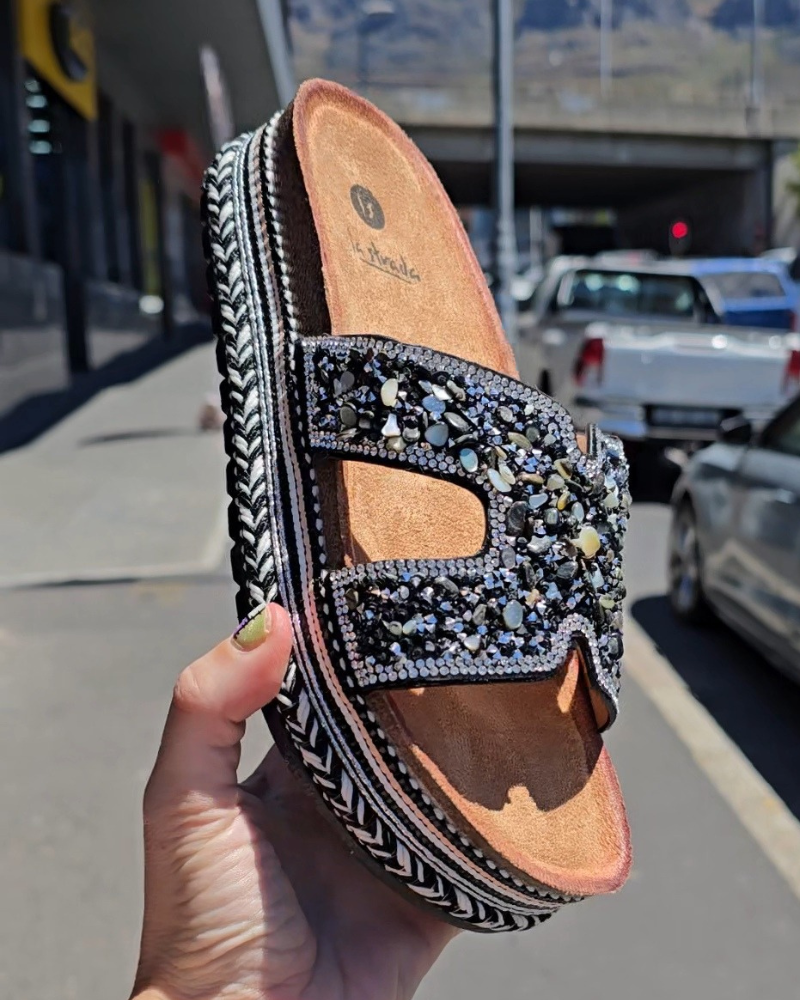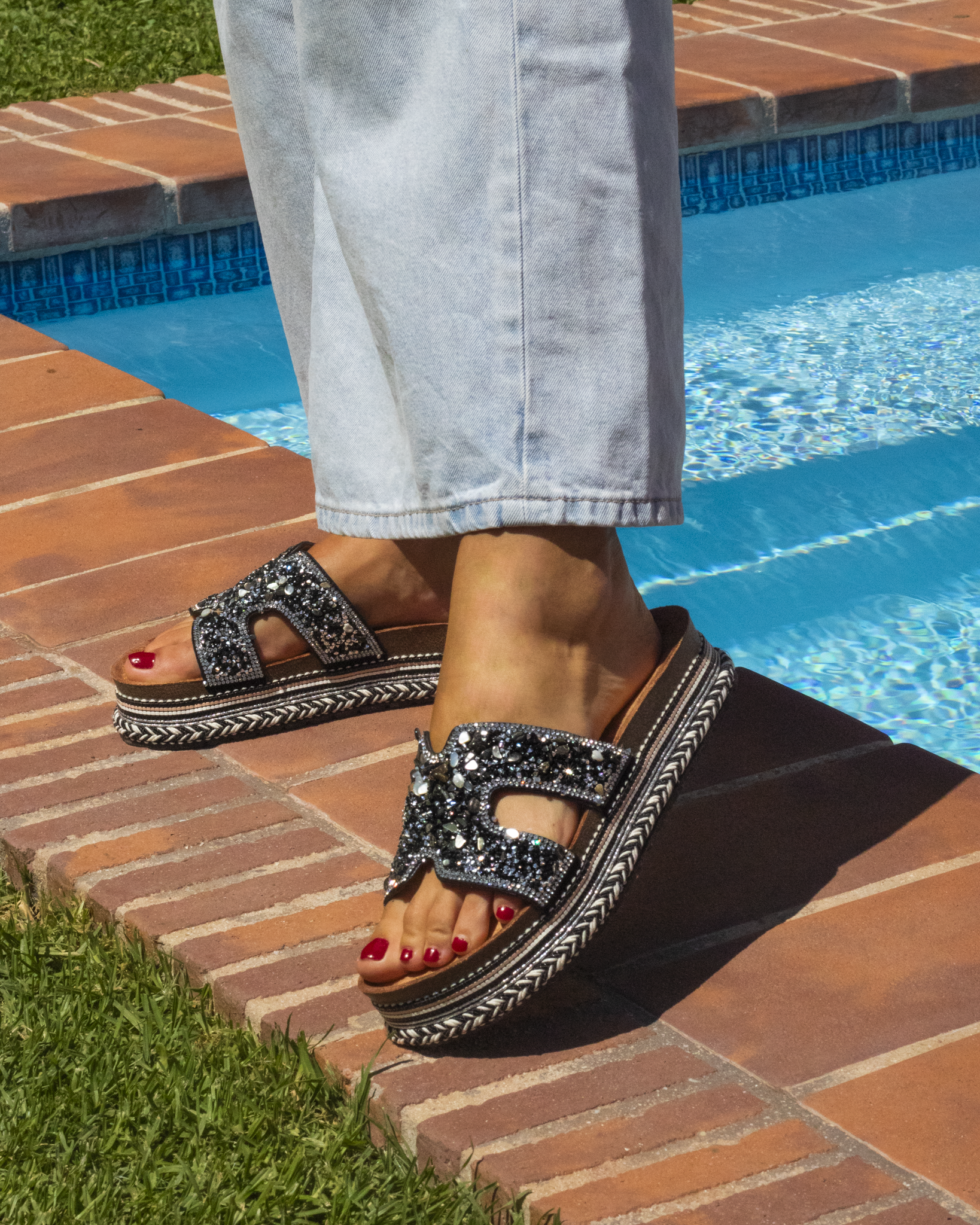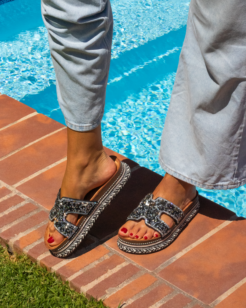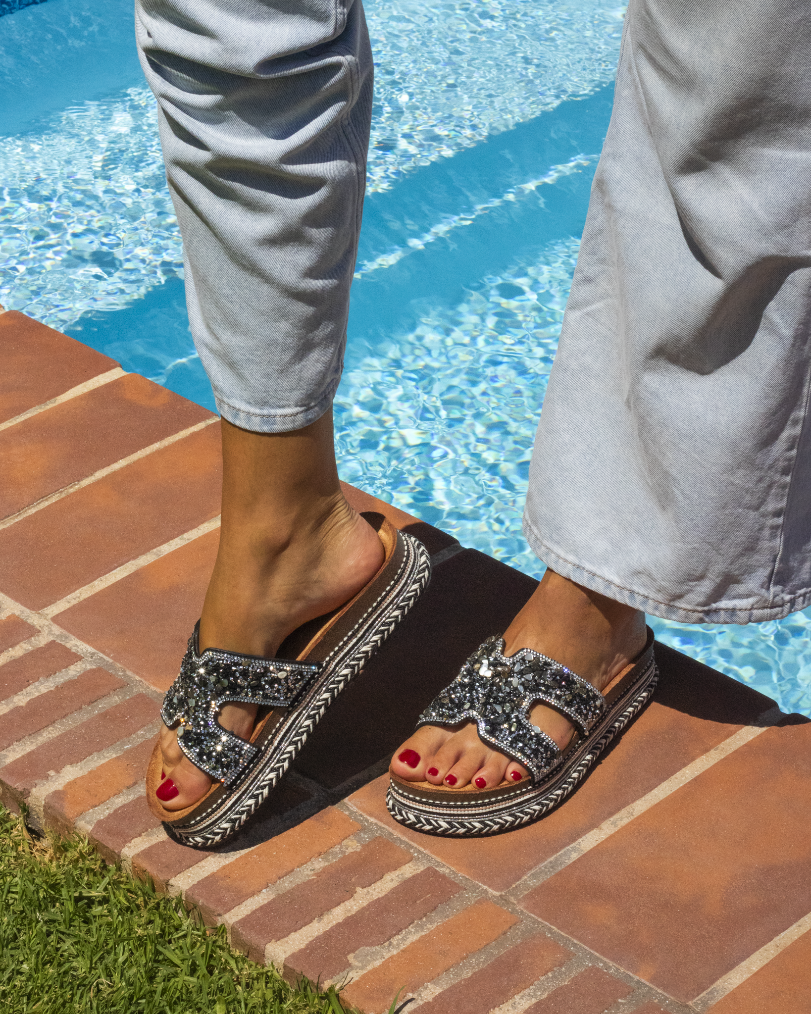 A casual summer espadrille slip-on with a touch of glitzy detailing for effortless warm-weather sparkle.
