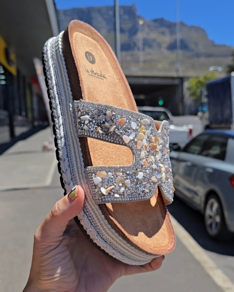 A casual summer espadrille slip-on with a touch of glitzy detailing for effortless warm-weather sparkle.