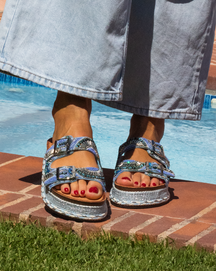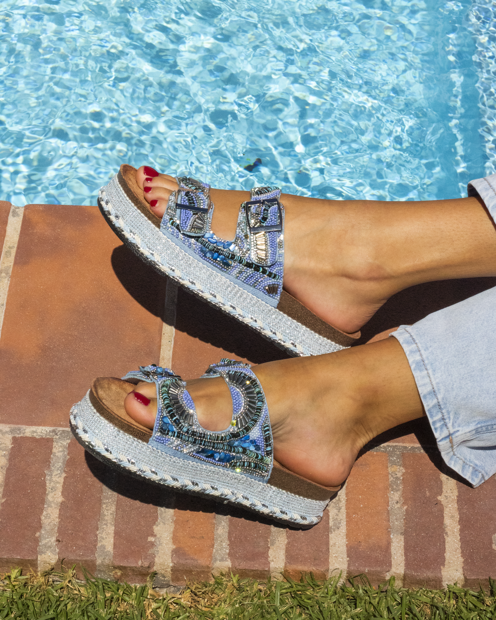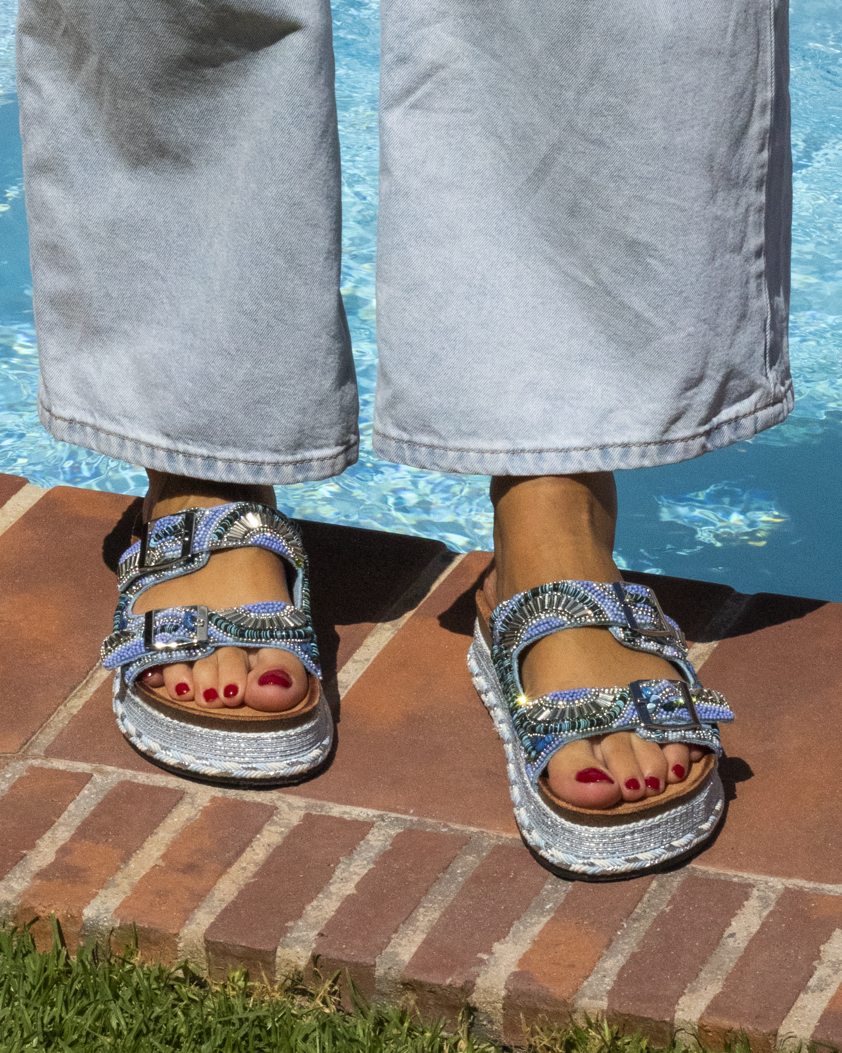 A breezy summer slip-on espadrille accented with just the right hint of glitz.