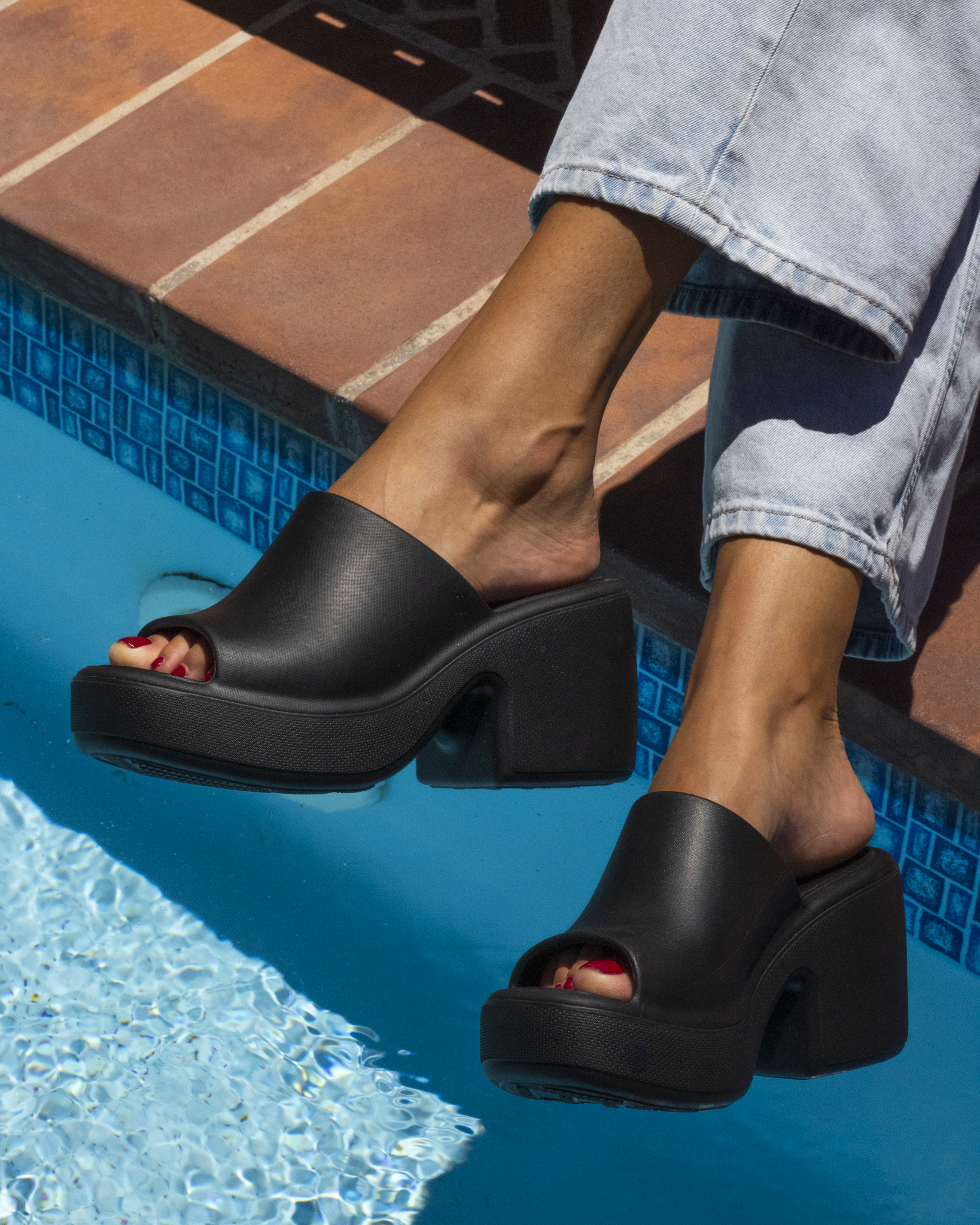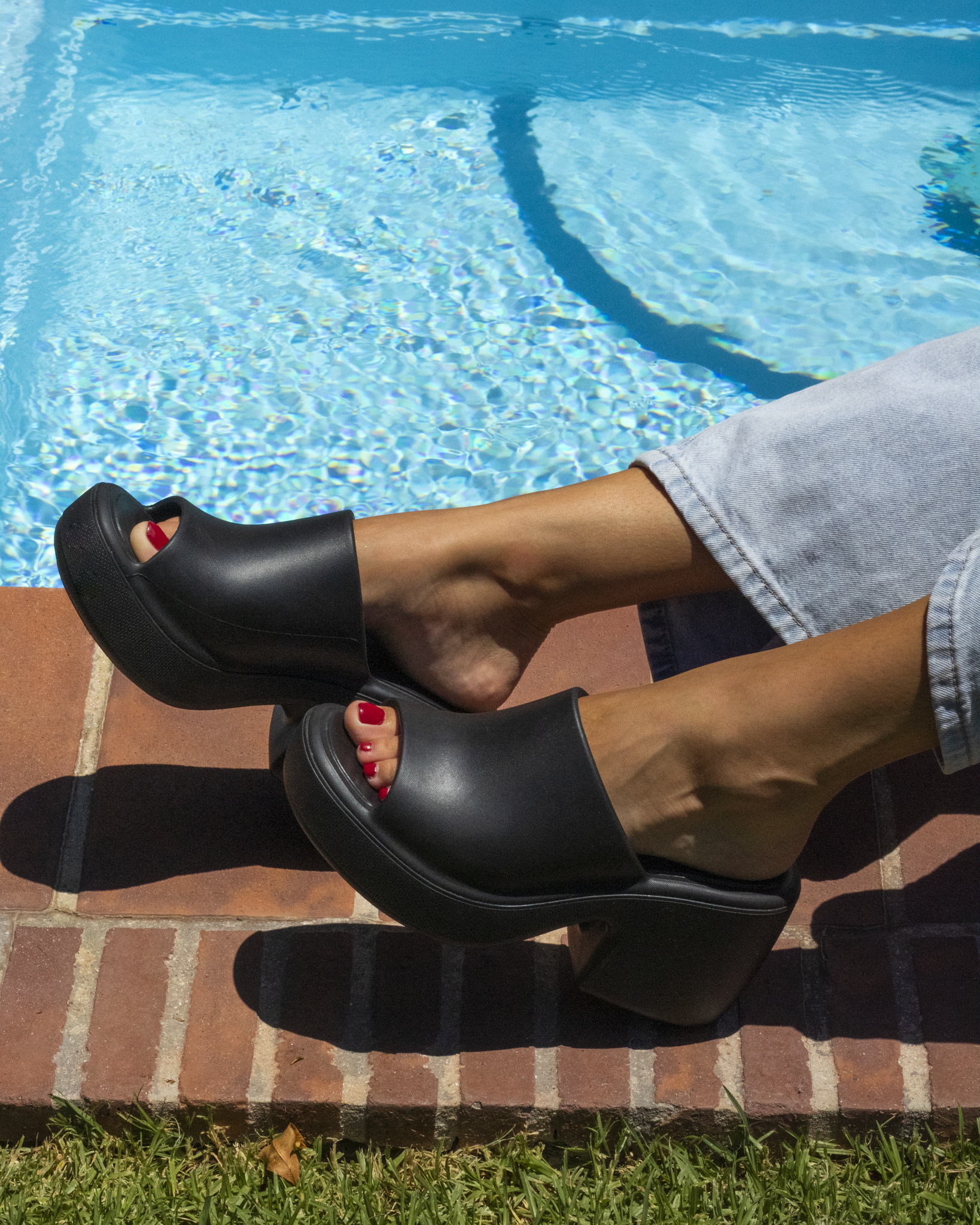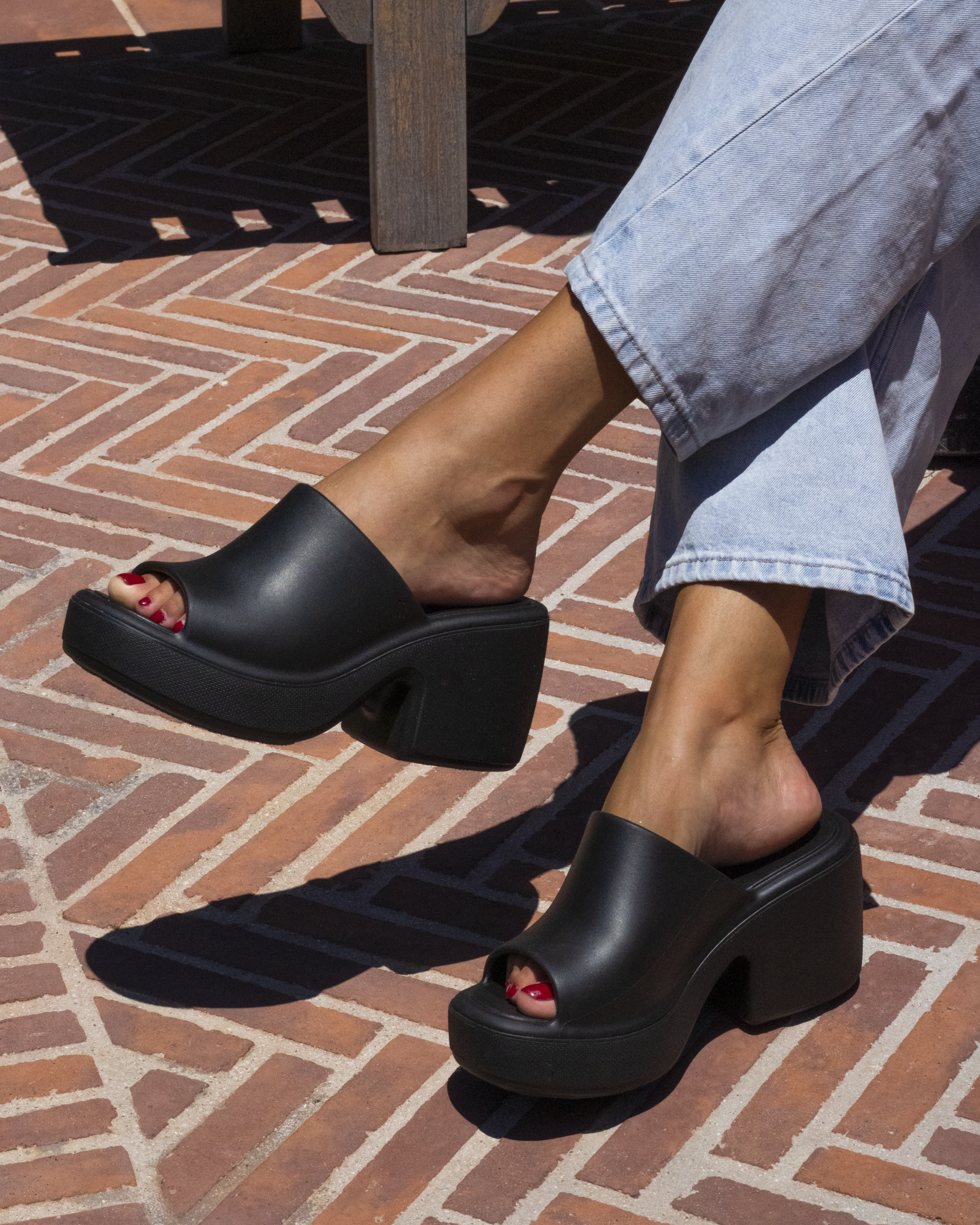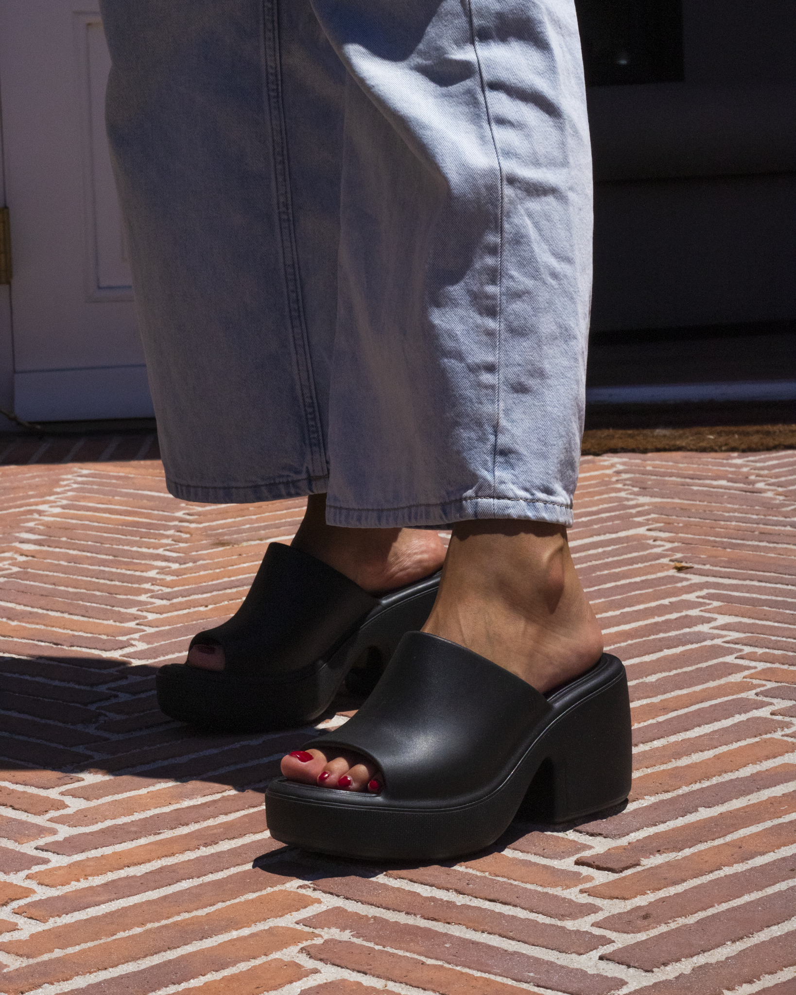 A heeled slip-on platform sandal.