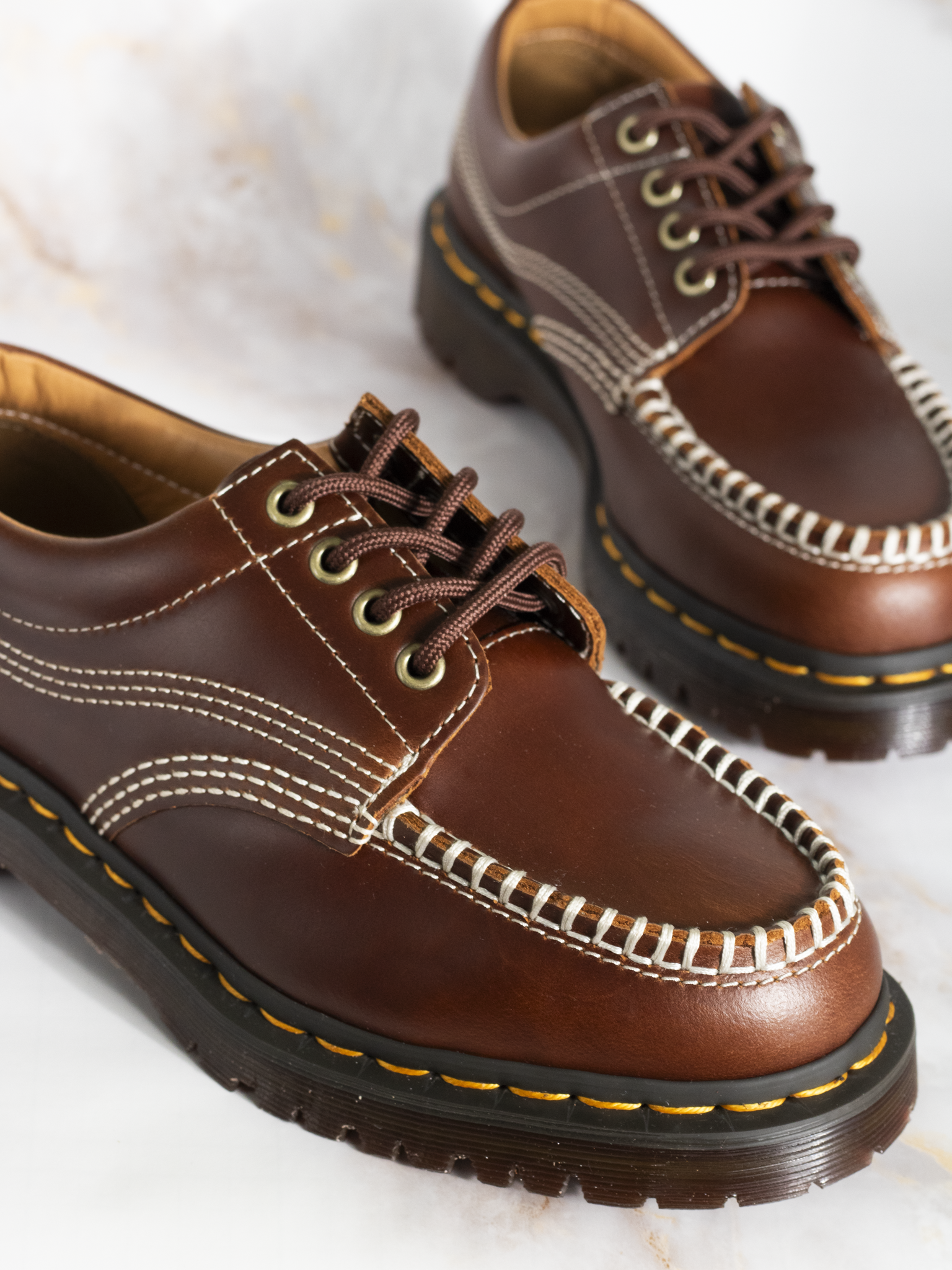 The Lowell blends contemporary aesthetics with archival workwear designs. A 4-eye shoe constructed from butterscotch Orleans leather with a comfort-focused padded collar. Highlighted with stitch detailing and finished with a moc toe. The Lowell stands on a rugged BEN outsole and secured with a yellow welt stitch.
