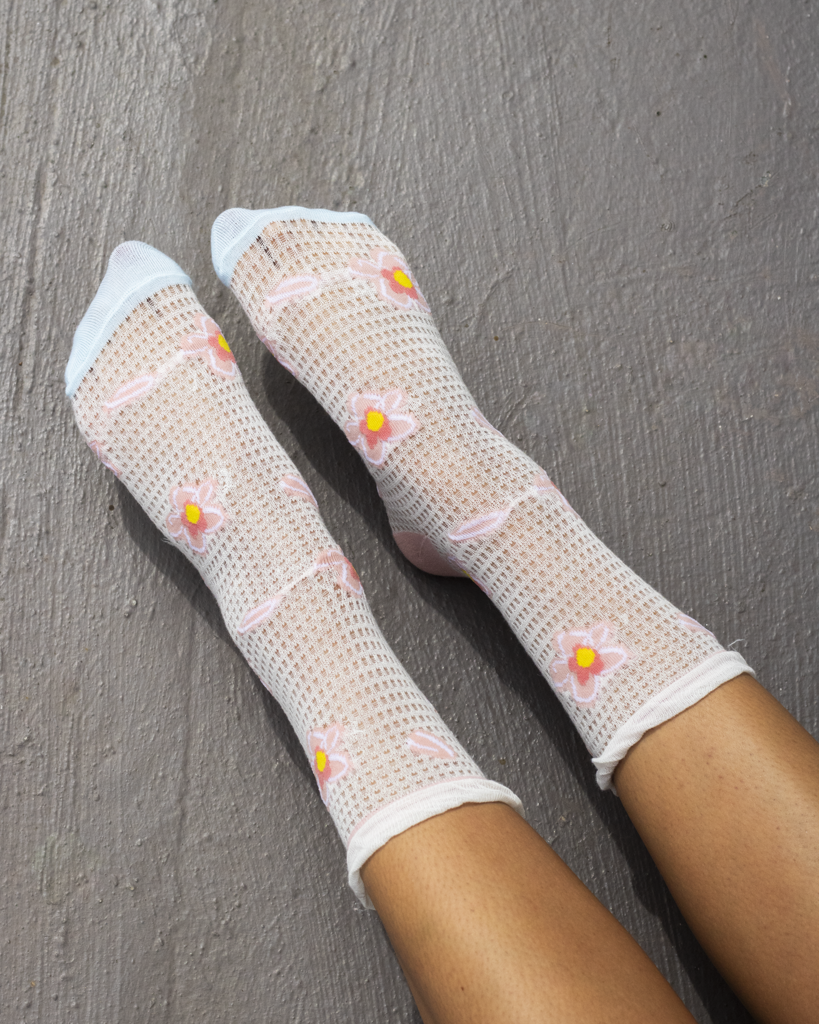 A frilled semi-sheer sock with delicate pink flower and leaf details.